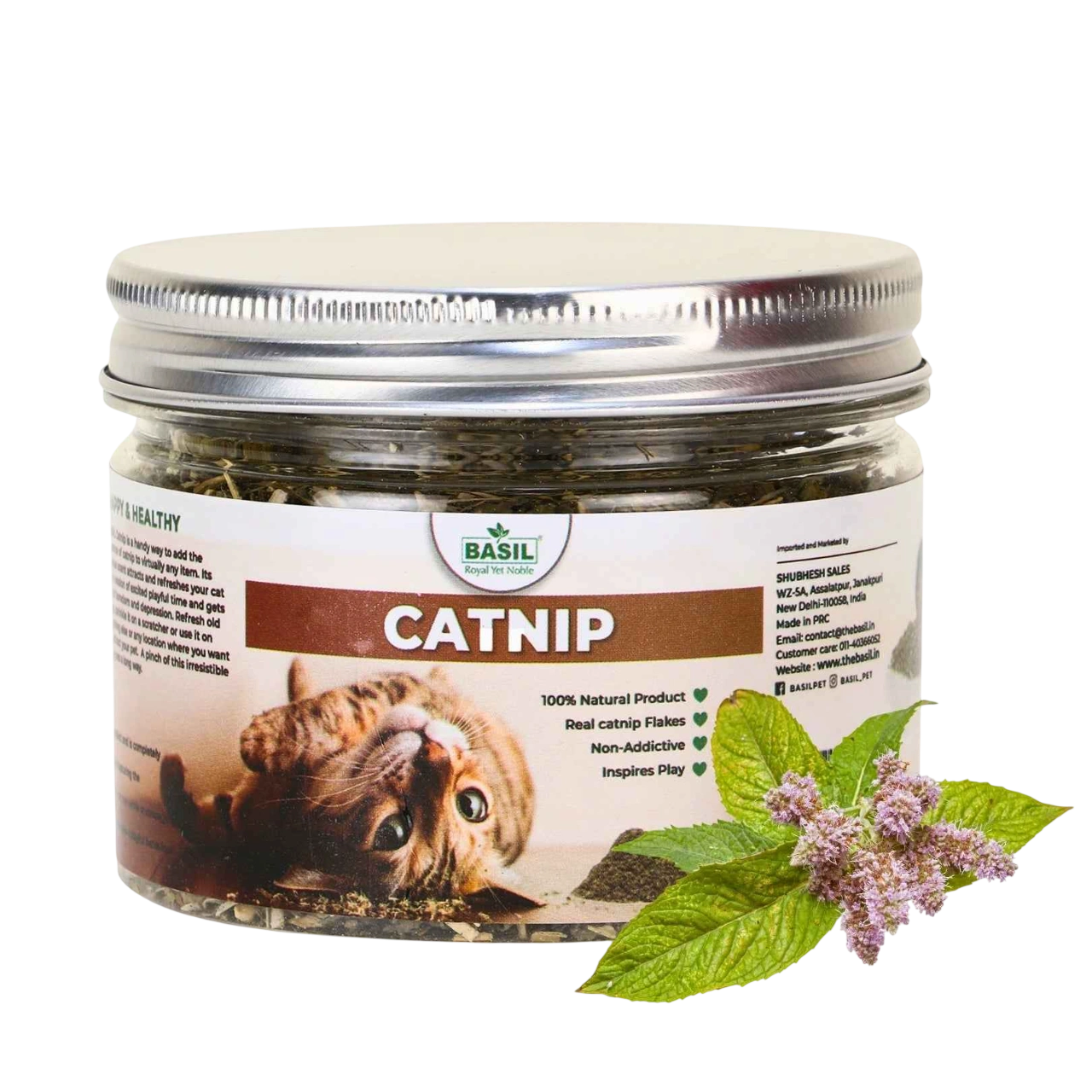 Catnip Jar by BASIL contains 100% natural, field-dried catnip flakes that spark excitement, playful energy, and positive scratching behavior in cats. Harvested at peak freshness, this catnip offers a strong natural aroma that attracts your cat instantly—perfect for refreshing old toys, sprinkling on scratchers, or adding fun to any play area. Safe, harmless, and highly potent, just a pinch is enough to boost your cat’s mood and reduce boredom.