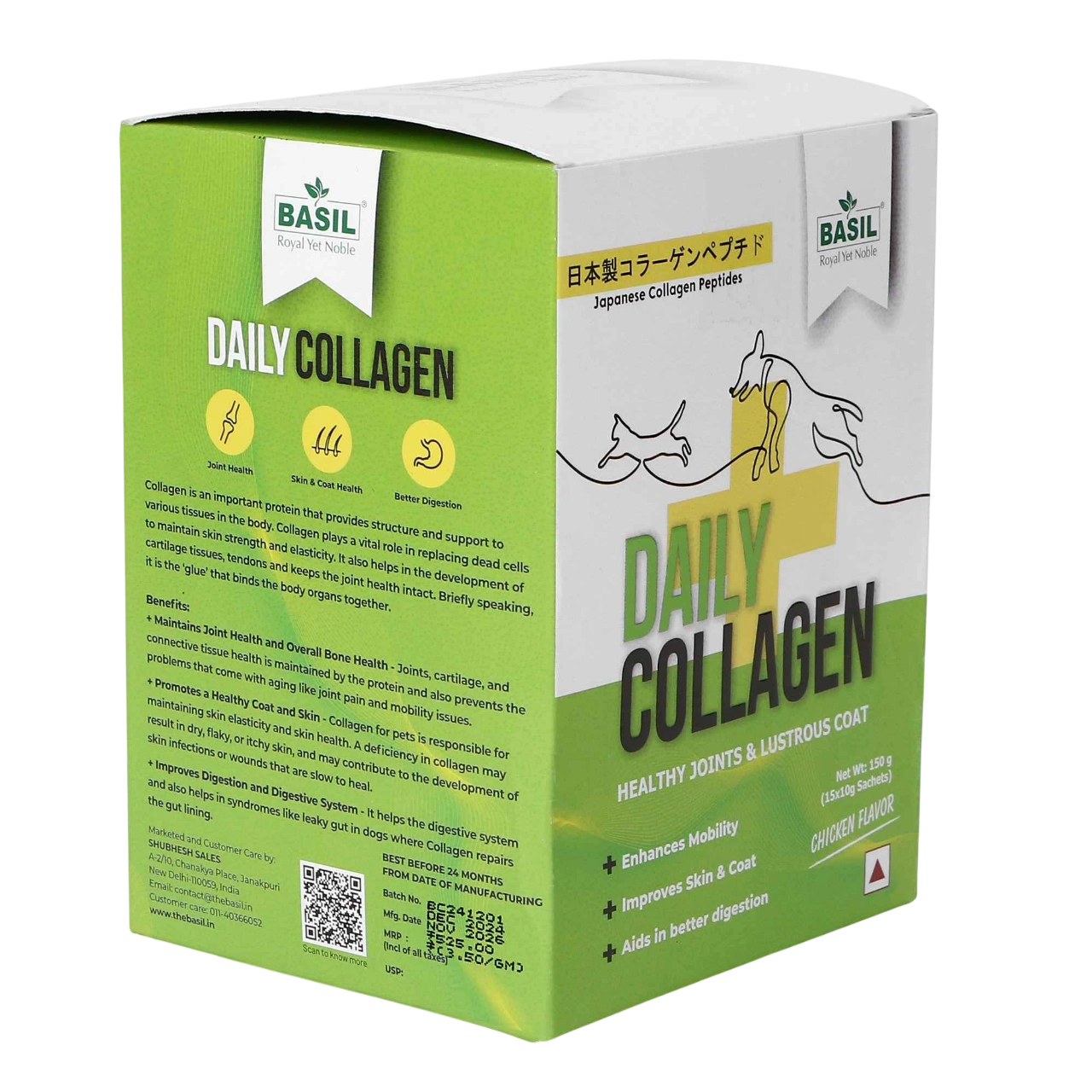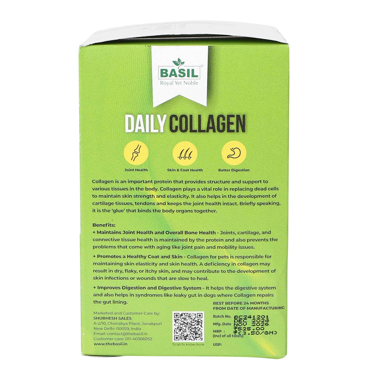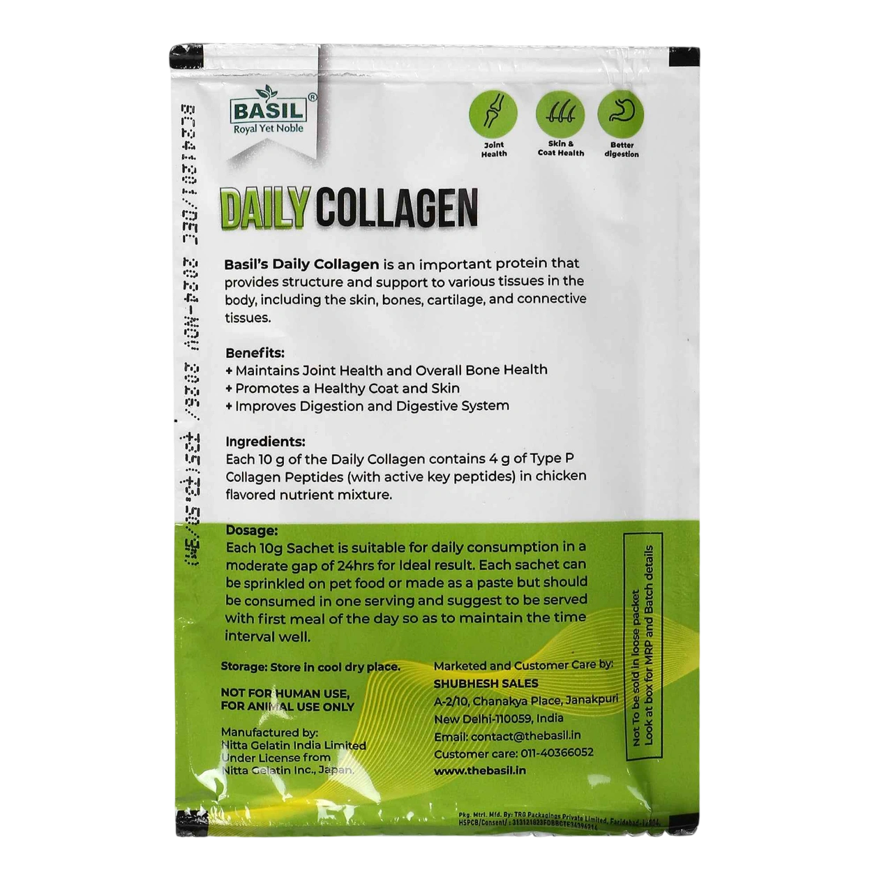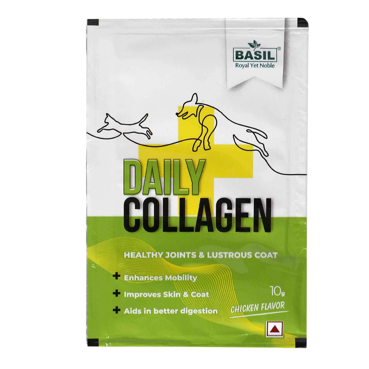 Specially formulated to support healthy joints, skin, and fur, BASIL Daily Collagen Supplement helps your furry friends stay active, comfortable, and radiant. Our premium collagen blend promotes better mobility, improved skin elasticity, and a shiny, soft coat. Suitable for both dogs and cats of all breeds and sizes, it's a simple addition to their daily routine that makes a big difference in their overall health and happiness.