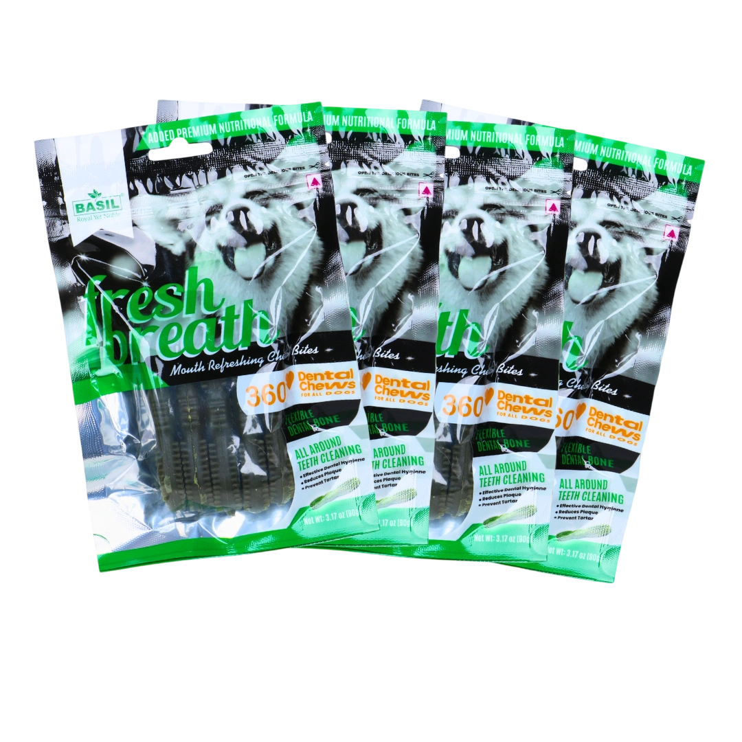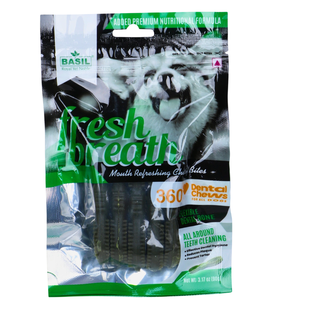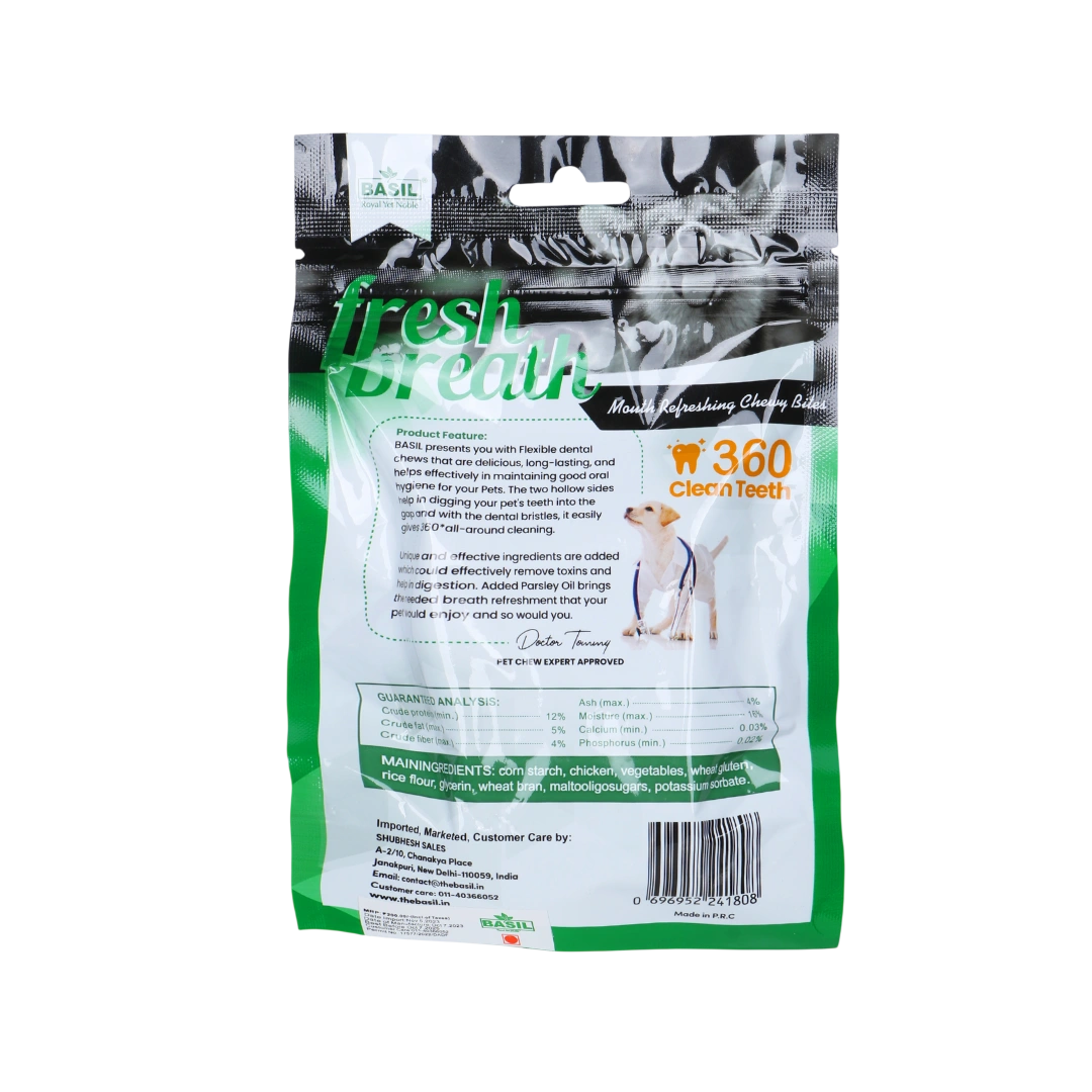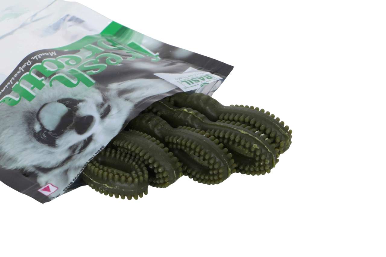 Dental Chew Treat for Dogs by BASIL is a unique 360° flexible chew designed to last longer than regular treats while improving your pet’s oral hygiene. Enriched with parsley oil, it naturally refreshes breath and helps fight odor-causing bacteria. Acting like chewing gum, the treat moves with your dog’s jaw and the bristle-like shape effectively scrapes away tartar, plaque, and trapped food—resulting in a fresh-smelling mouth and cleaner, healthier teeth. Key Features – Dental Chew Treat for Dogs 🔄 360° Flexible Chew: Lasts longer and moves with the dog’s jaw for continuous cleaning. 🌿 Added Parsley Oil: Helps freshen breath and fight odor-causing bacteria. 🧹 Bristle-Like Texture: Scrapes off plaque and tartar during chewing. 😁 Fresh Breath Support: Promotes cleaner teeth and fresher mouth. 🐾 Great for Oral Hygiene: Helps reduce tooth decay and common dental issues.