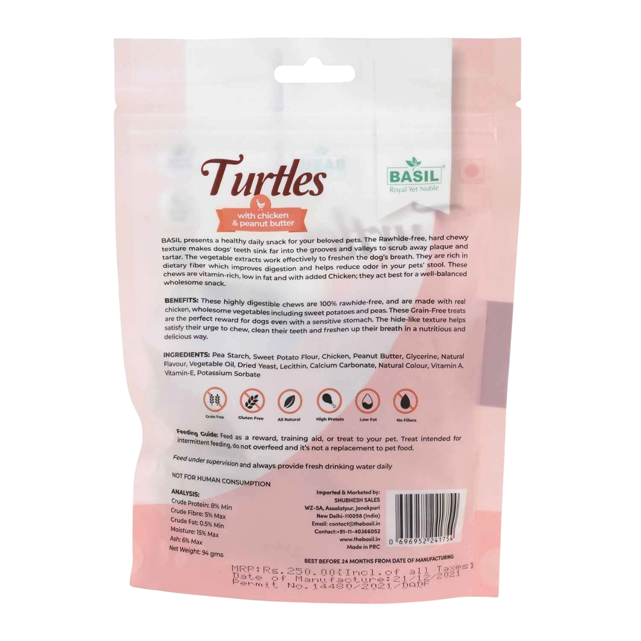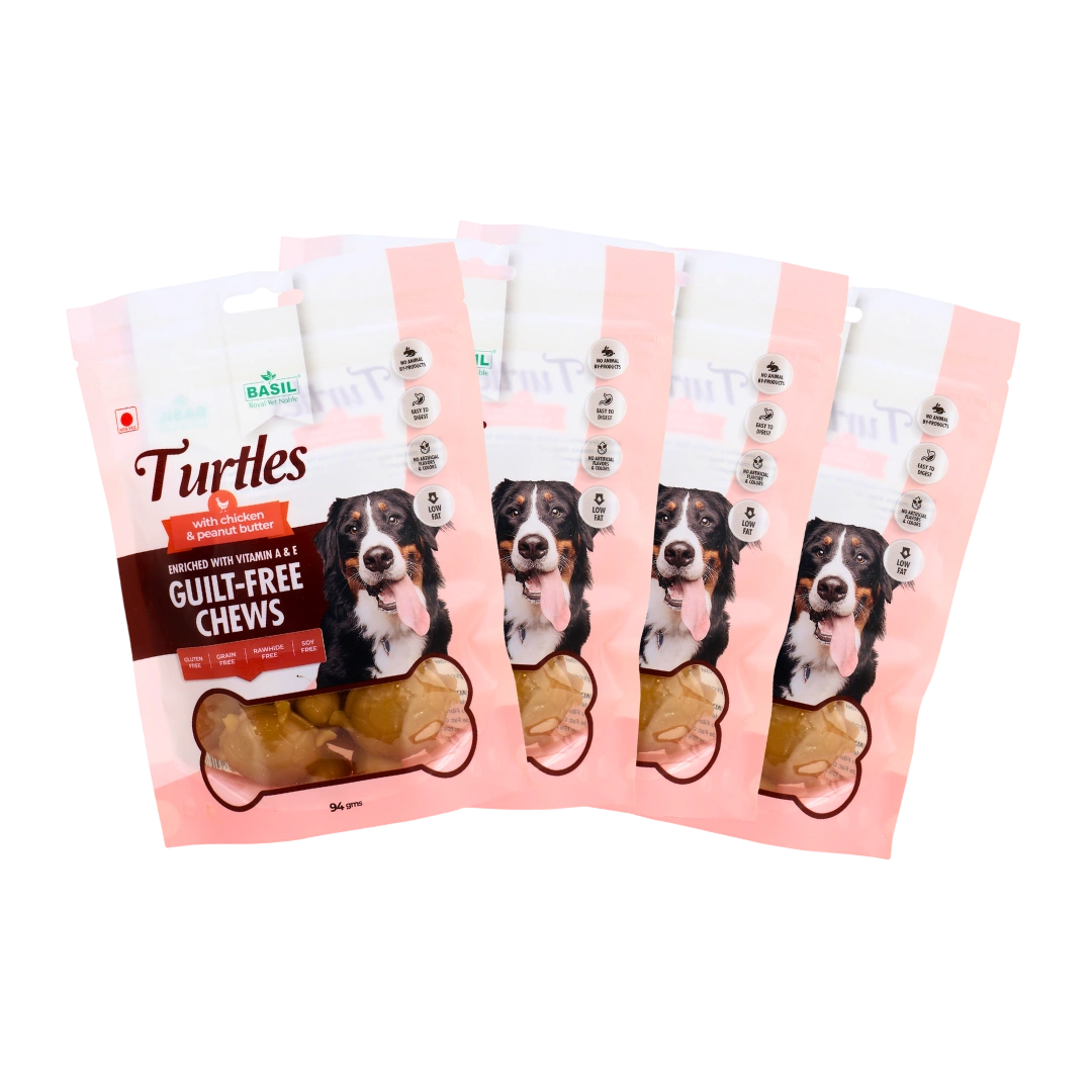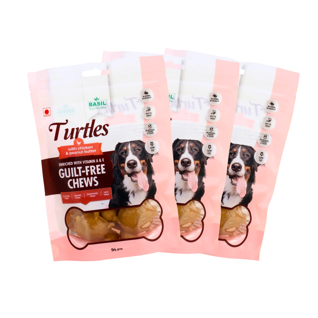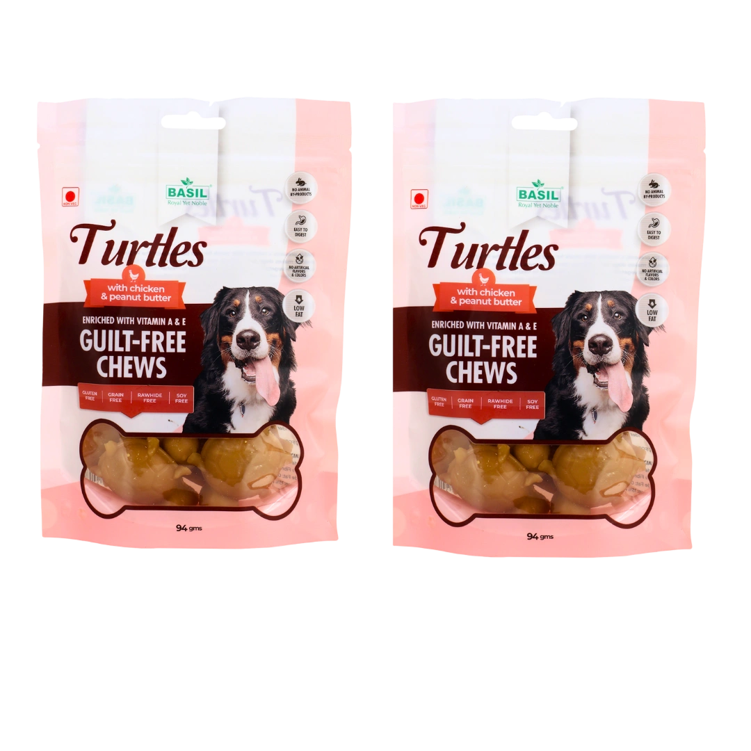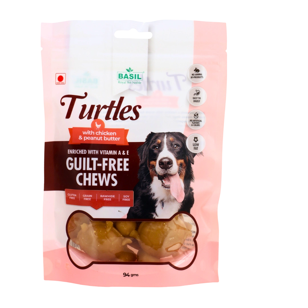 Guilt-Free Treat for Dogs by BASIL is a delicious and nutritious snack made with real chicken and creamy peanut butter—perfect for puppies and adult dogs. Crafted with natural, high-quality ingredients, this chewy turtle-shaped treat is rich in protein, easy to digest, and free from artificial preservatives, colours, and flavours. With a texture that supports dental health and a flavour dogs love, it’s the ideal everyday reward. Key Features – Guilt-Free Treat for Dogs 🍗 Premium Ingredients: Made with real chicken and peanut butter for a protein-rich, flavorful treat. 🌱 Truly Guilt-Free: Low fat and free from artificial colours, flavours, and preservatives. 📦 Convenient 94g Pack: Perfect for daily snacking, training, or rewarding good behaviour. 🦷 Supports Dental Health: Chewy texture helps reduce plaque and massage gums. 🐶 Suitable for All Dogs: Great for puppies and adult dogs of all breeds and sizes. 🌿 Easy to Digest: Gentle on the stomach and ideal for dogs with sensitive digestion.