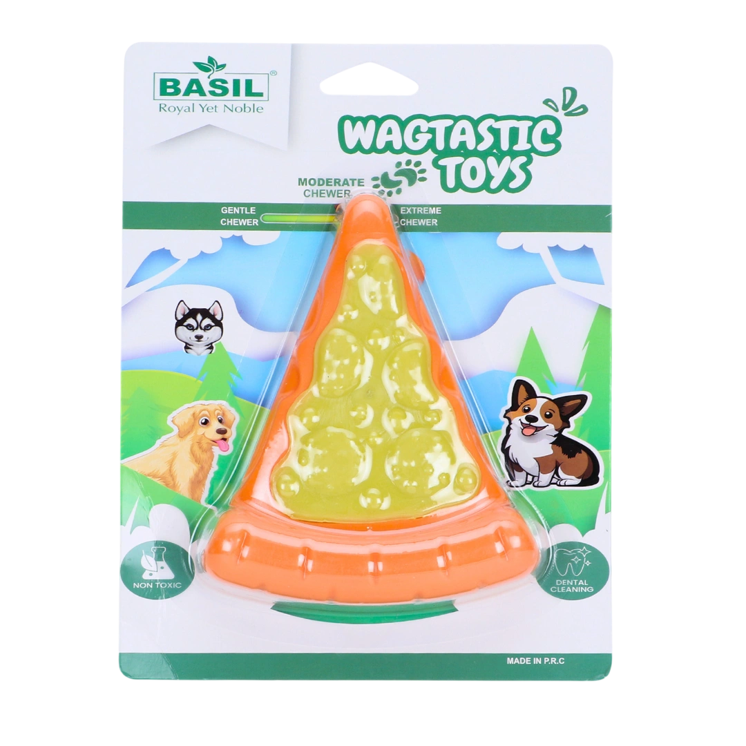 The BASIL Wagtastic TPR Pizza Slice Chew Toy is designed to satisfy your dog's chewing instincts while keeping them entertained. Made from durable TPR material with a textured yellow nylon topping, this fun and interactive toy is perfect for teething puppies and adult dogs alike. The orange pizza slice design adds a playful touch, making it an ideal choice for solo play or bonding time with your pet. It also helps maintain dental health by cleaning teeth and massaging gums as they chew.